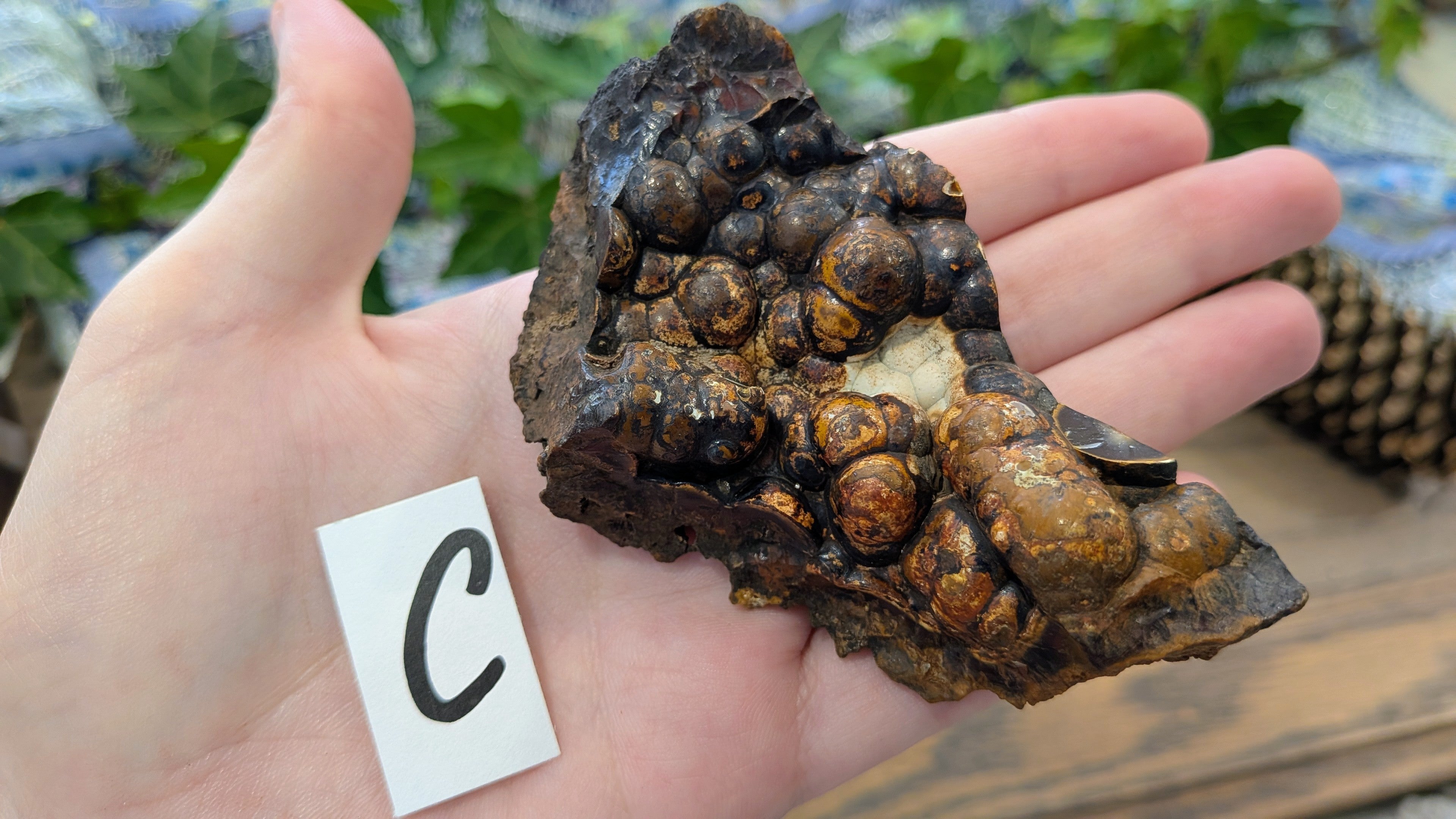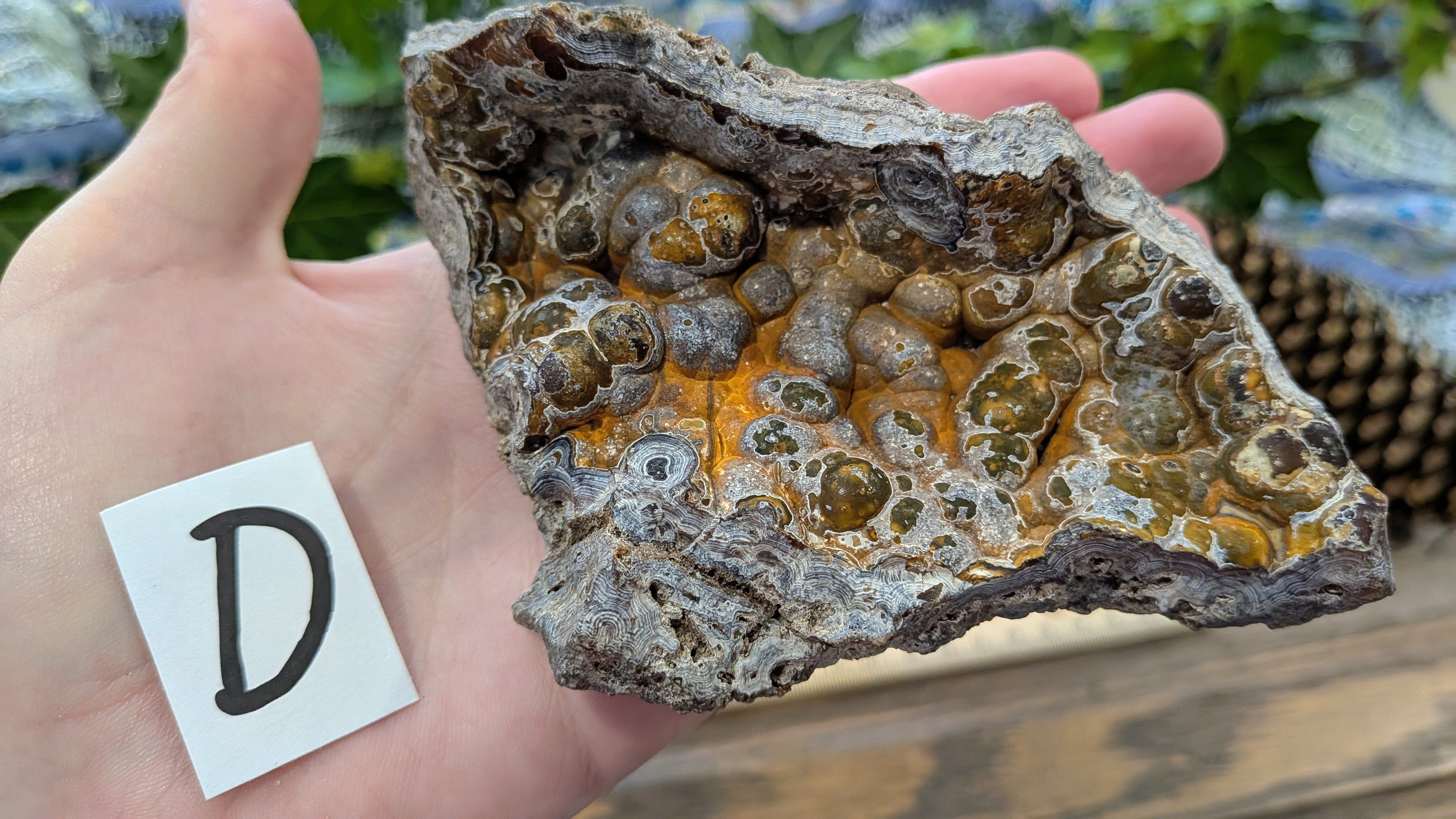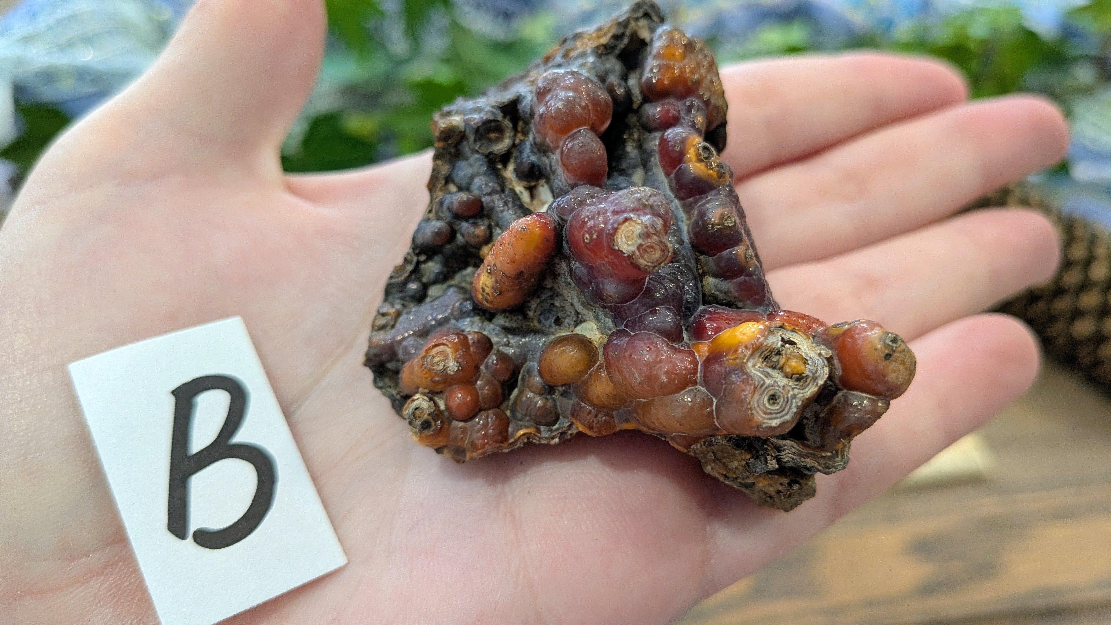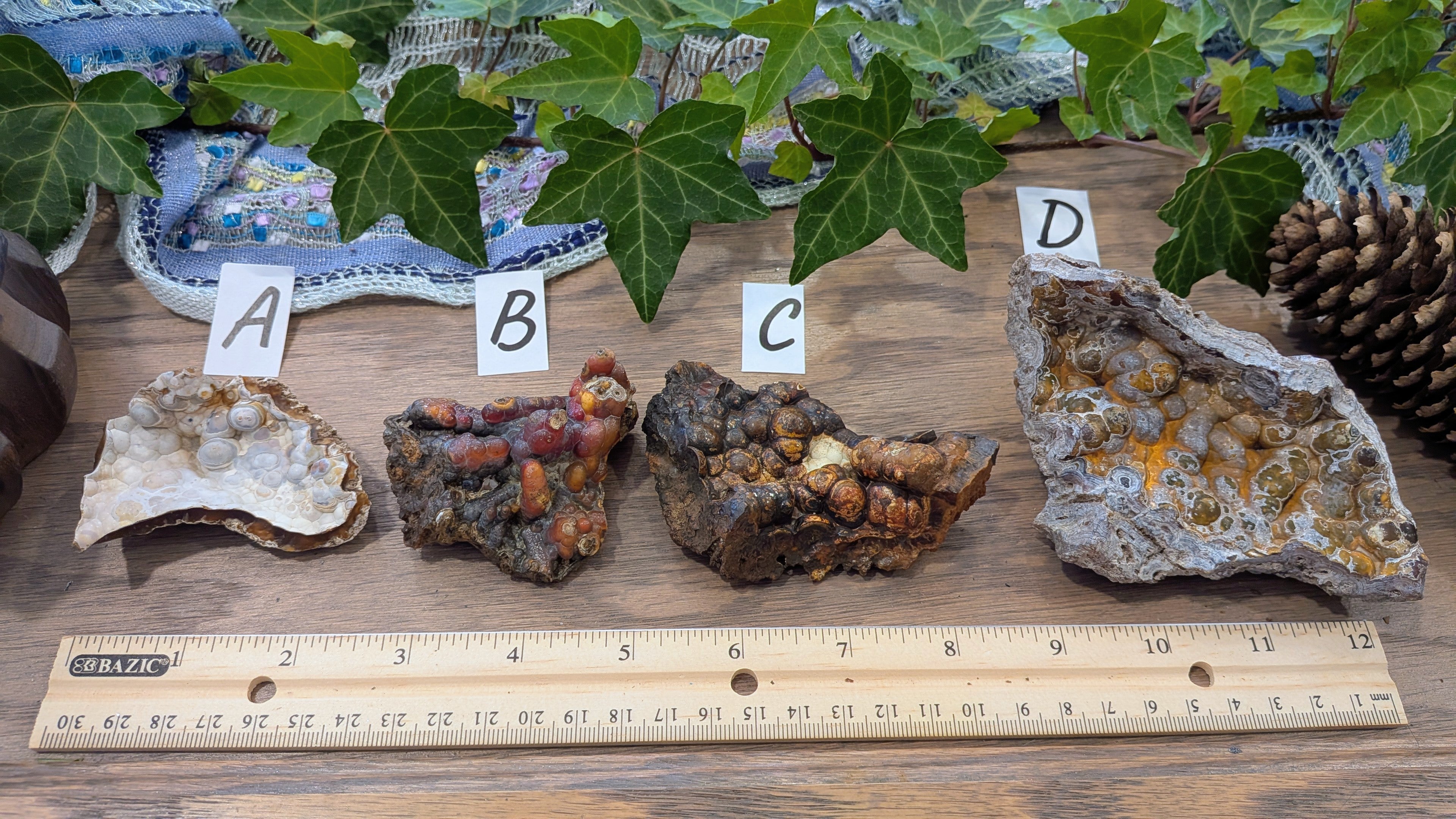 These fossil coral geode fragments are composed of thick translucent amber agate coated with river minerals.
