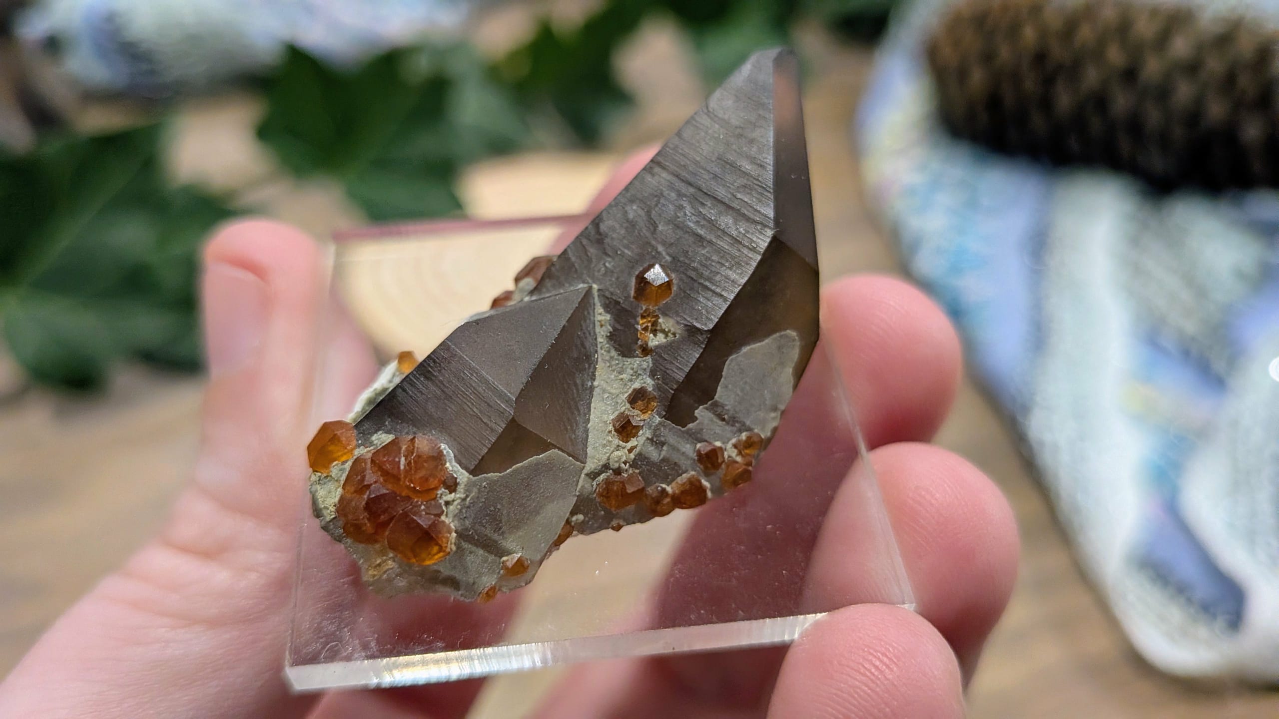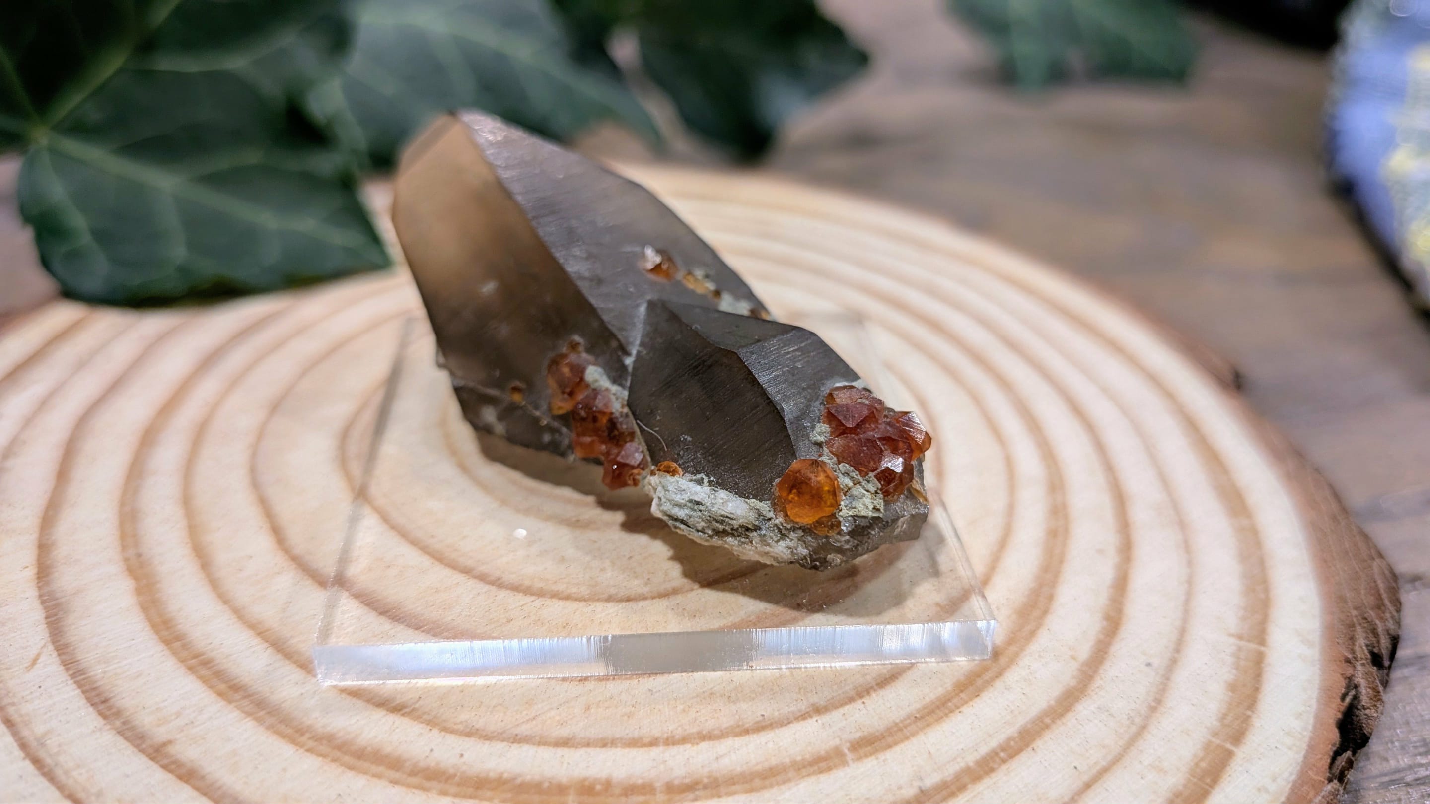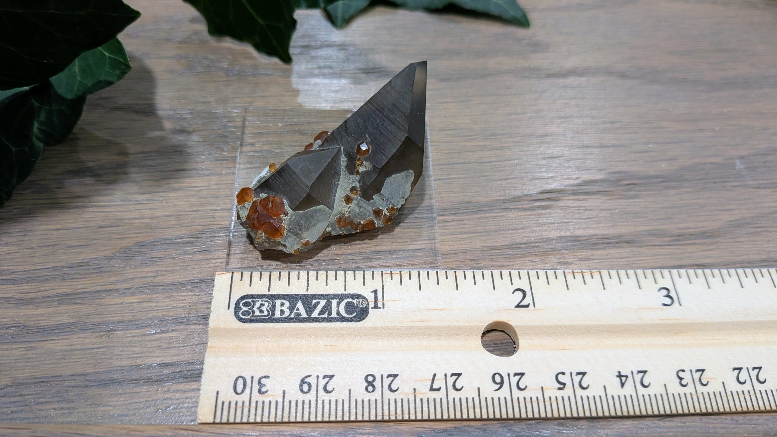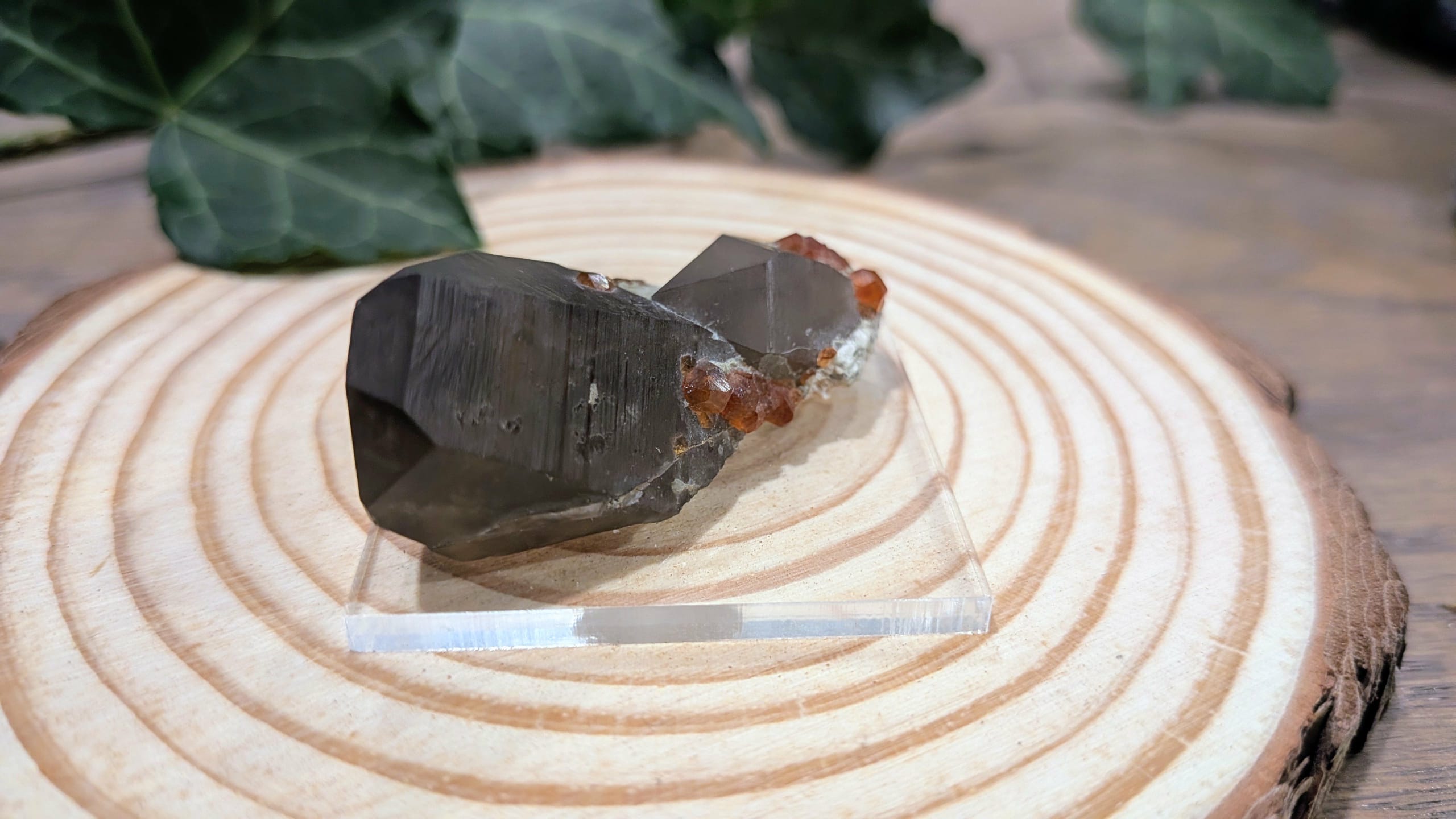 This miniature specimen is a vivid geological conversation between shadow and fire, originating from the world-famous Wushan Spessartine Mine in China. The dominant form is a perfectly terminated, deep Smoky Quartz point, which anchors the piece with its ancient, grounding energy and velvet-dark luster. Cradled at its base, like molten jewels cooled in the rock, are clusters of gemmy Spessartine Garnet along with Hyalite in the form of a pale opaline film.