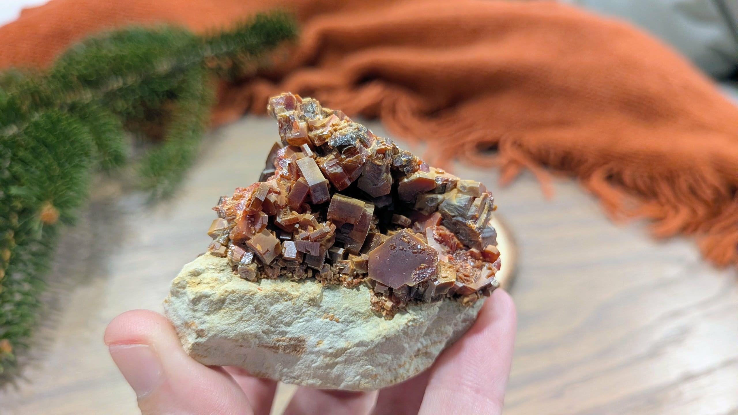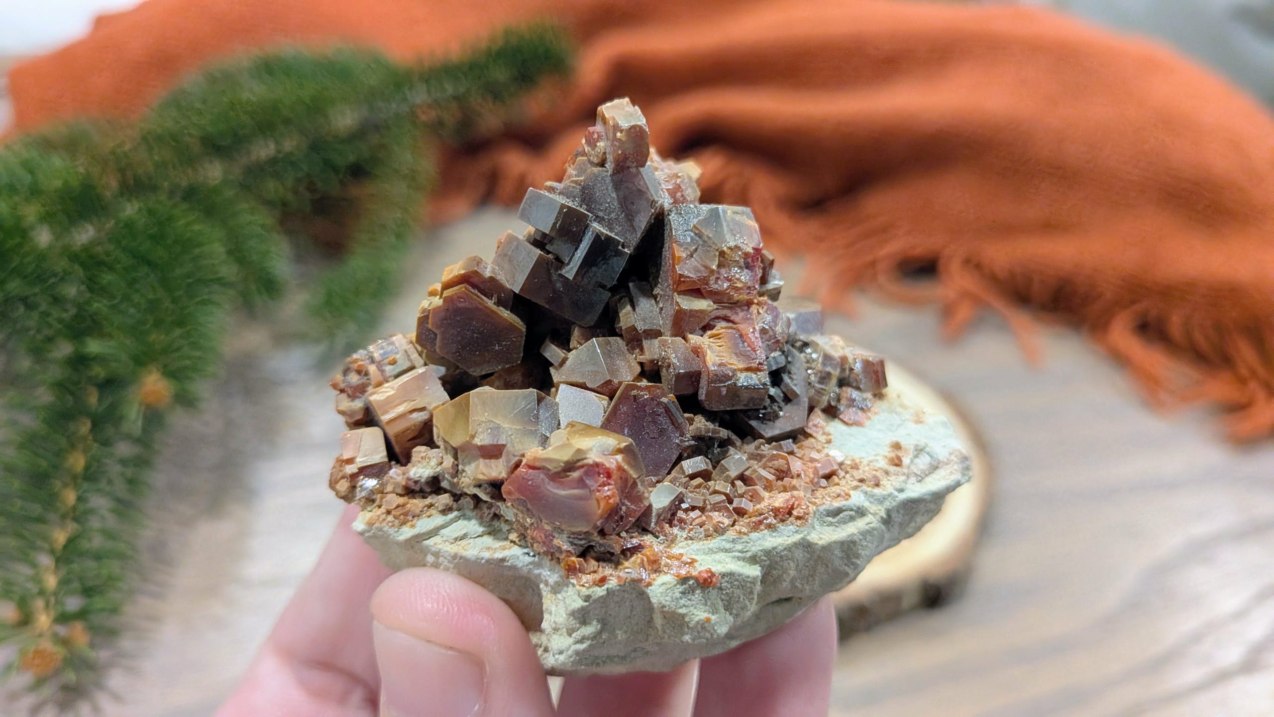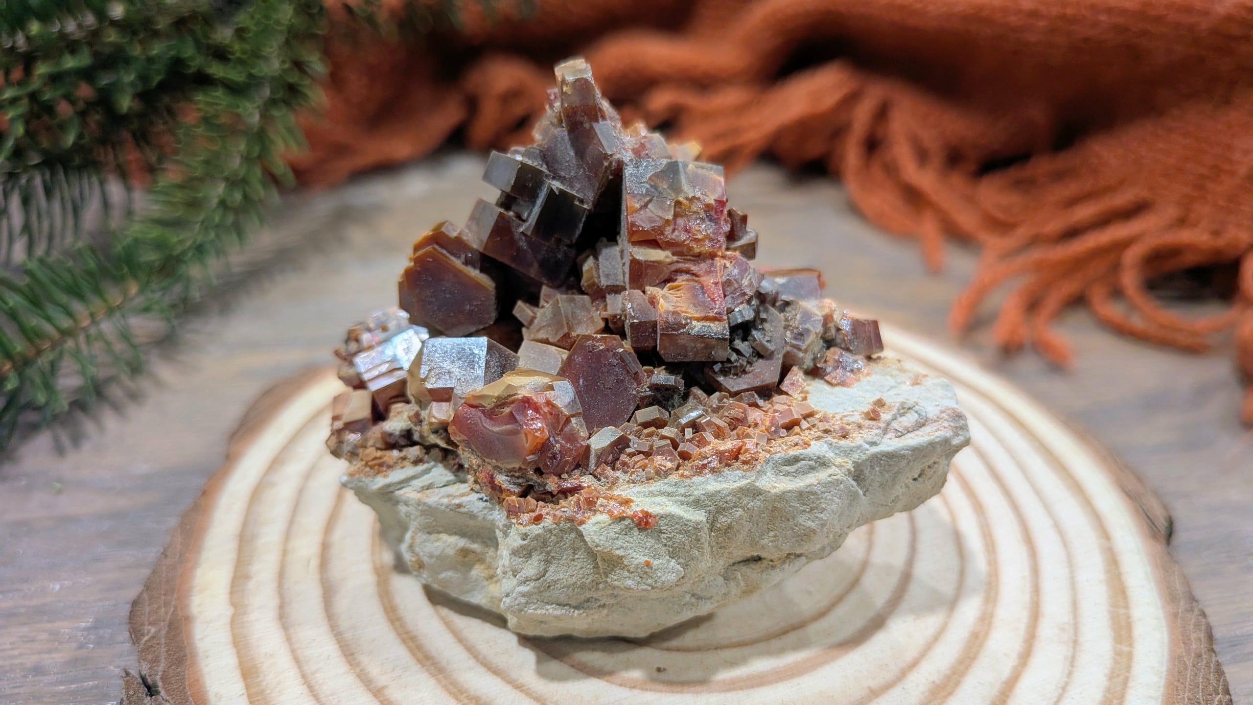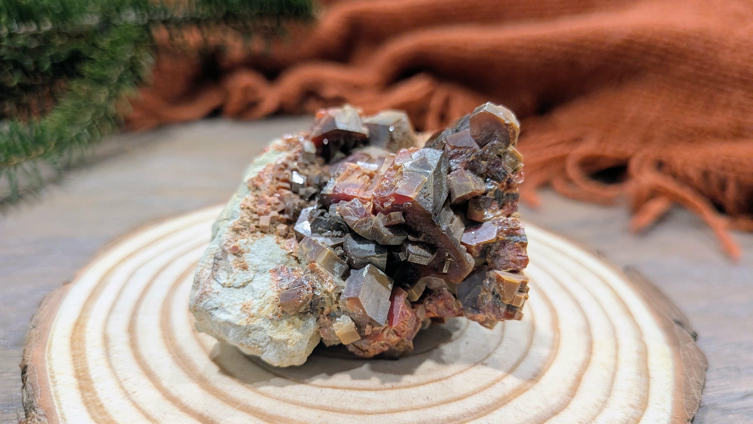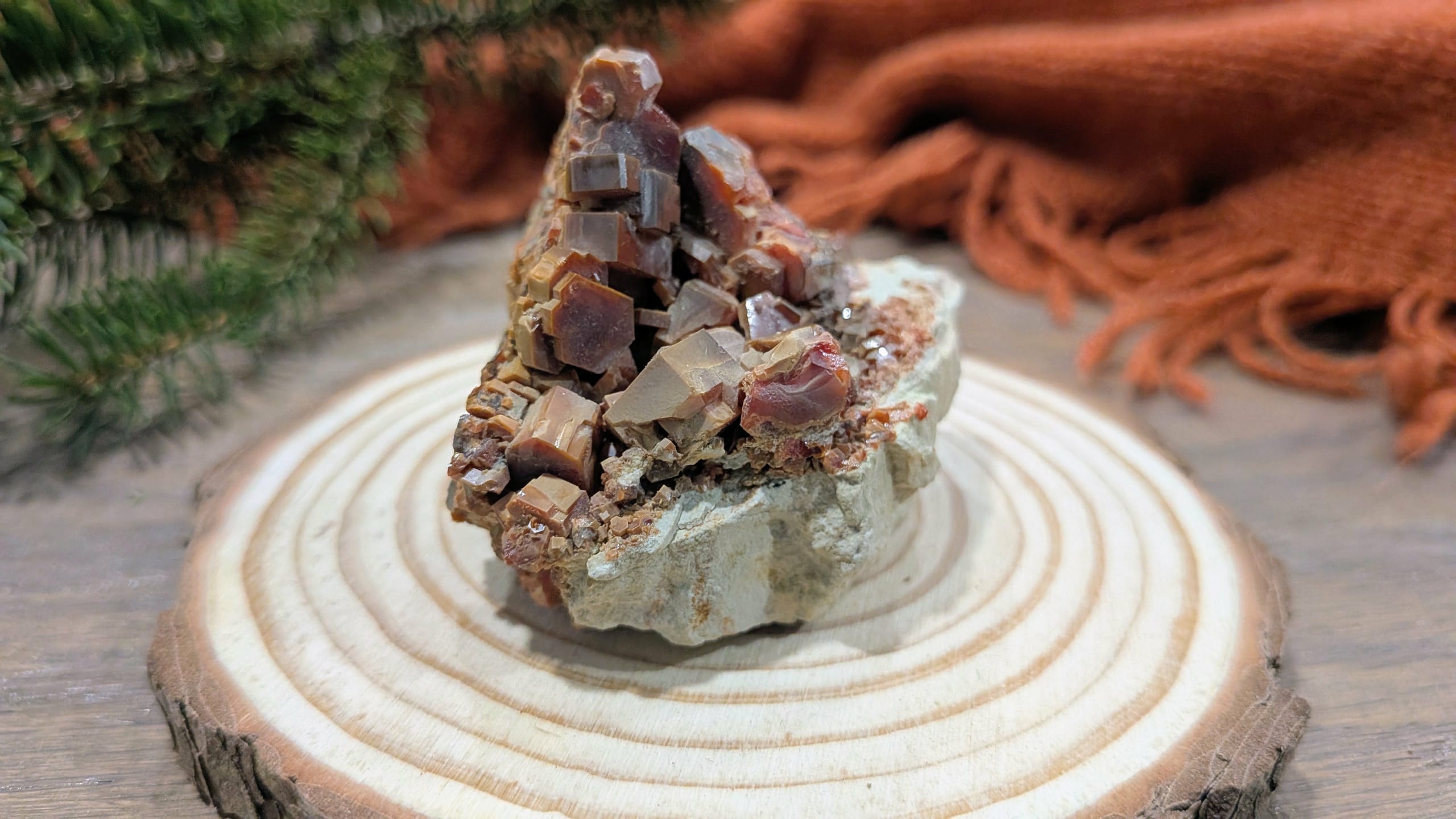Born from the arid alchemy of the desert, Vanadinite forms as fiery-red hexagonal crystals that seem to hold the memory of desert suns.